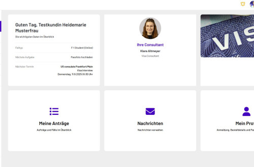 Über unser US Visa Portal können Schüler:innen und Familien das jeweilige Visum buchen und erhalten damit Zugang zu ihrem persönlichen US Visa Account. Dort haben Antragstellende jederzeit den Überblick über den gesamten Antragsprozess, hinterlegen alle erforderlichen Daten, laden Dokumente hoch und können direkt mit ihrer persönlichen Visa Consultant in Kontakt treten.